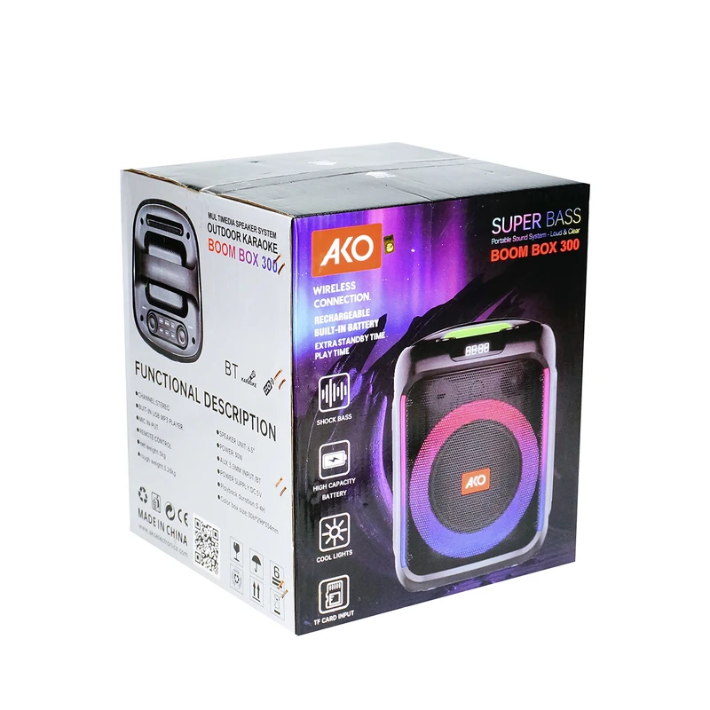 مشخصات اسپیکر بلوتوثی قابل حمل Boom box 300 نسخه بلوتوث: v5.1 برد بلوتوث : 10 متر پشتیبانی: جک 3.5 صدا و فلش دارای: میکروفون بی سیم ظرفیت باتری: 3000 میلی آمپر ساعت دارای: یک بلندگوی 6.5 اینچی توان خروجی کلی: 30 وات